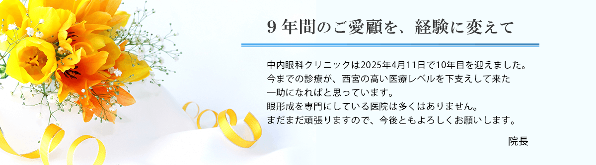 平成28年4月に西宮北口に開業いたしました、中内眼科クリニックです。当院は一般眼科をはじめ、外眼部の形成分野(まぶたの病気)の治療に特に力を入れております。