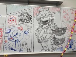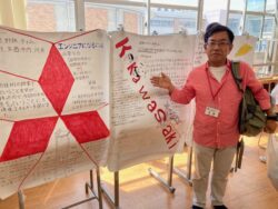 並びのクラスの展示を見た後、今日のメイン、「梶子ママ」のお話を去年に引き続いて11時から聞くために、10時50分に教室にイン。ちょうど前方に席が空いていて、僕と長男。10時55分に、嫁さんと、僕の探検部の同期の高須君が座れた😆 この辺も、ラッキーでしょ。