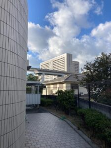 僕は服部から往復15kmを原付で通っていたけど、長女は車もバイクも乗れないので、病院の近くに住む。下宿から阪大病院が見える、孤高の殿堂。